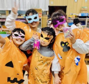 ハロウィンイベント 瑞穂西松原学童保育クラブ 2025.12.26 10月31日にハロウィンパーティーを行いました👻 今日の為に衣装や仮面を制作しました。 パーティーではBOXくじ、ダンス、キョンシージャンケンなどみんな楽しく遊びました😊