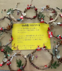 支援員が自宅で収穫したツルやドライフラワー、どんぐりやまつぼっくり…世界で一つだけの素敵なリースができました✨